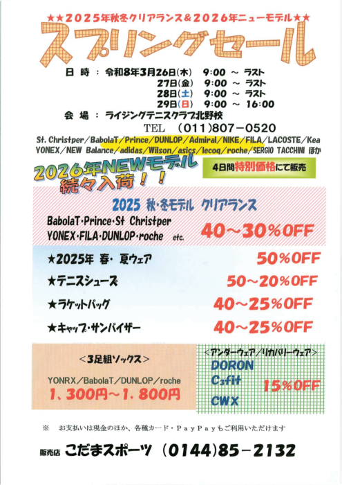 こだまスポーツ スプリングセールを3月26日(木)~29日(日)まで北野校で開催します! ご来場お待ちしております!