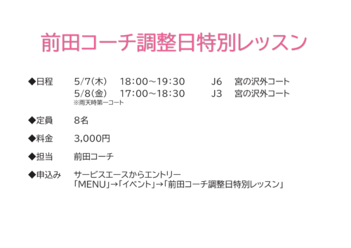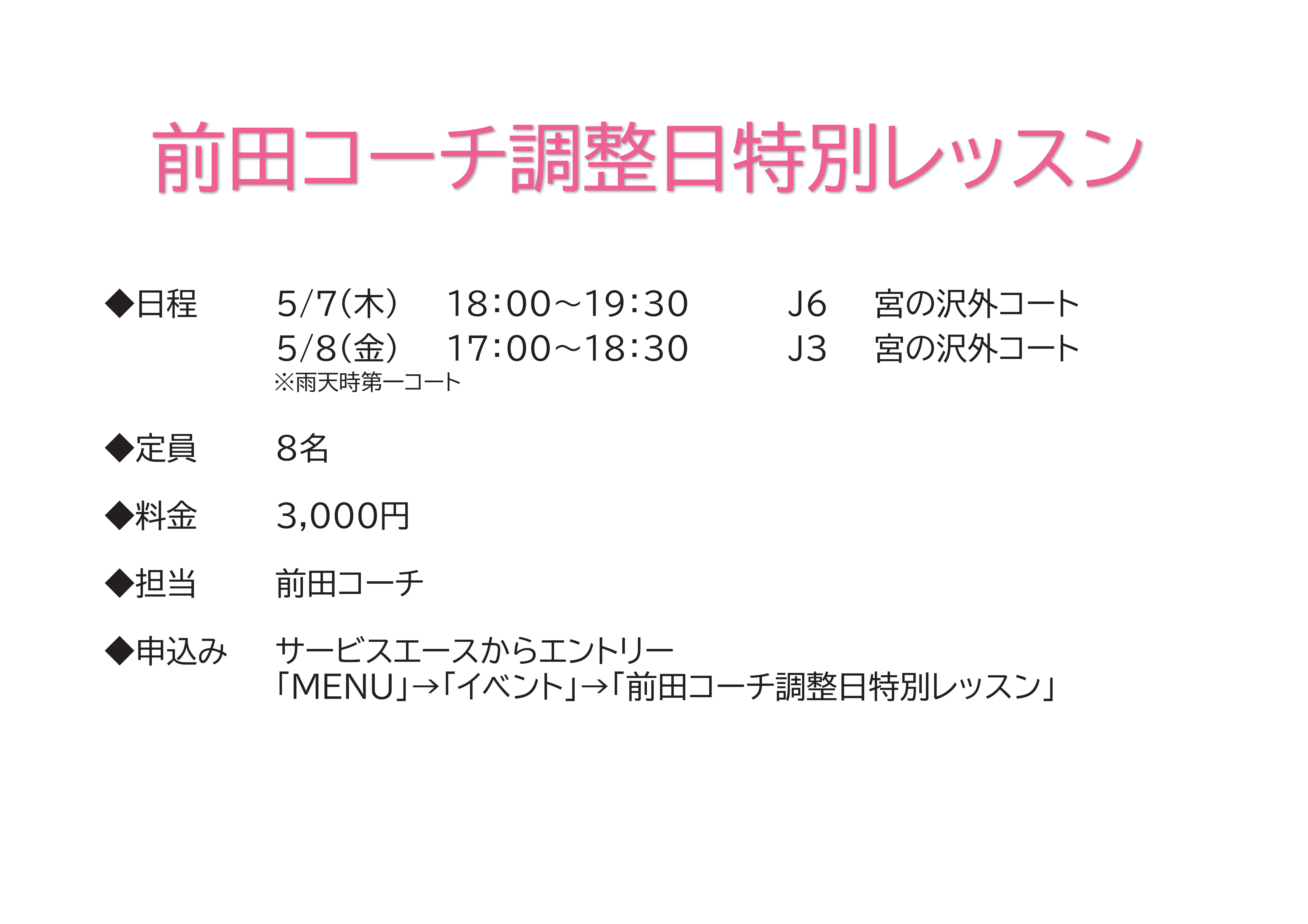 前田コーチ調整日特別レッスンを宮の沢外コートで行います! 各日サービスエースからエントリーをお願いします!