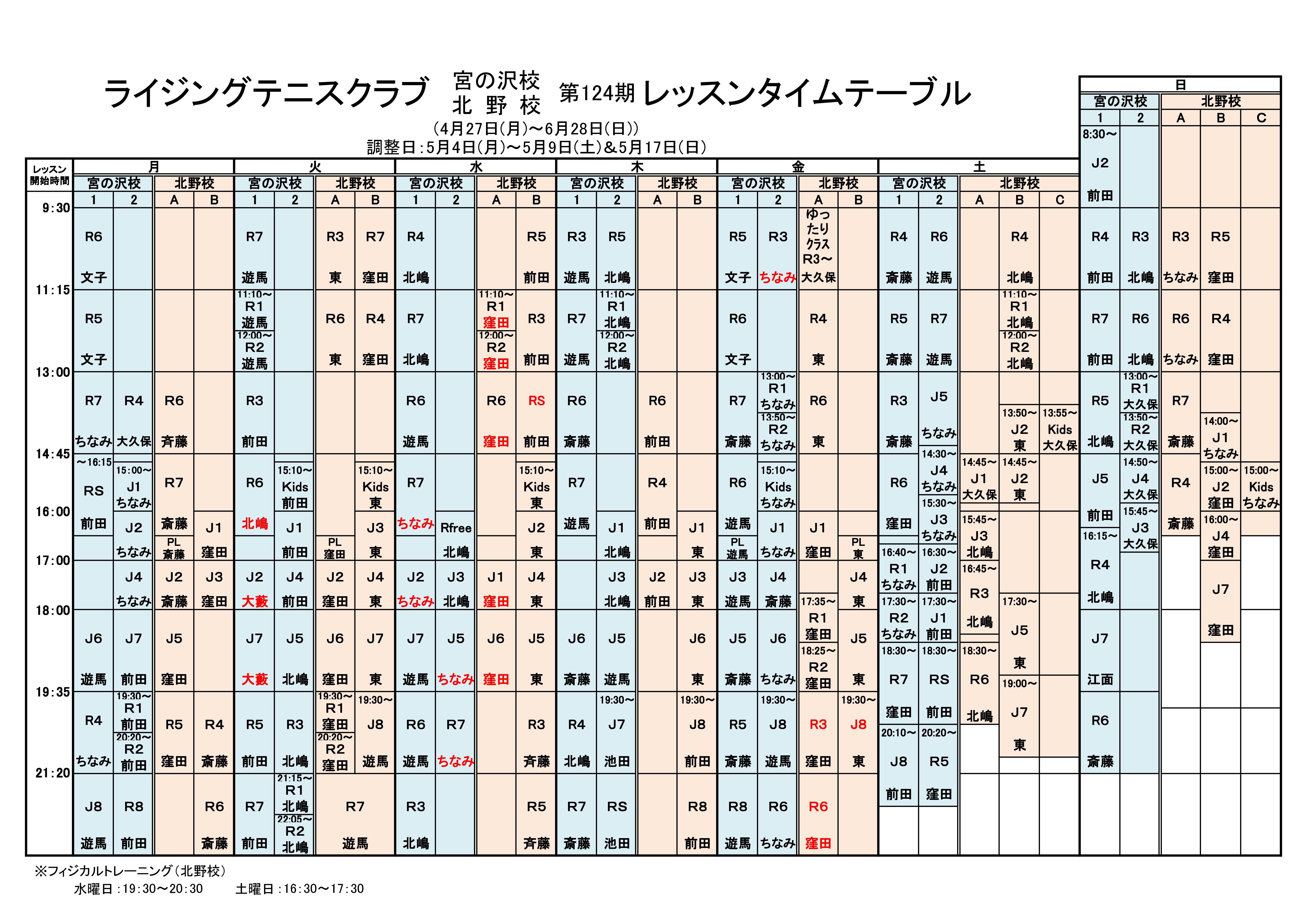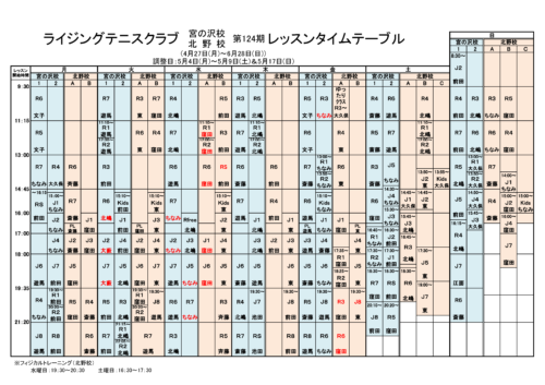 2026.04.27 124期レッスンタイムテーブル追加変更のお知らせ ライジングテニスクラブ 124期タイムテーブルについて追加変更をお知らせします。 【北野校】 ・コート変更:金曜日R6(21:20~)Bコート⇒ Aコート